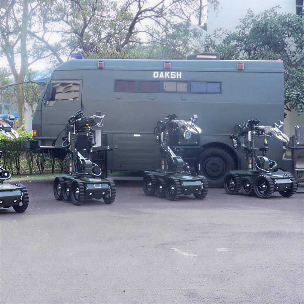 Designed for modular expansion, DAKSH integrates seamlessly with specialized sensors, control modules, and ruggedized displays. It supports versatile mobility, including stair climbing, rough terrain navigation, and transportation-ready deployment.